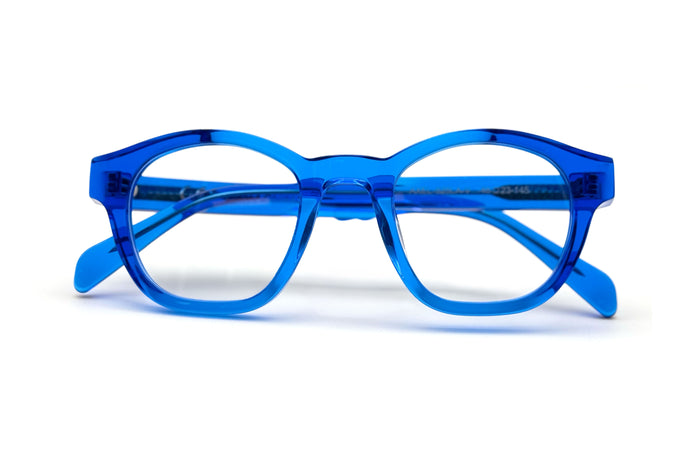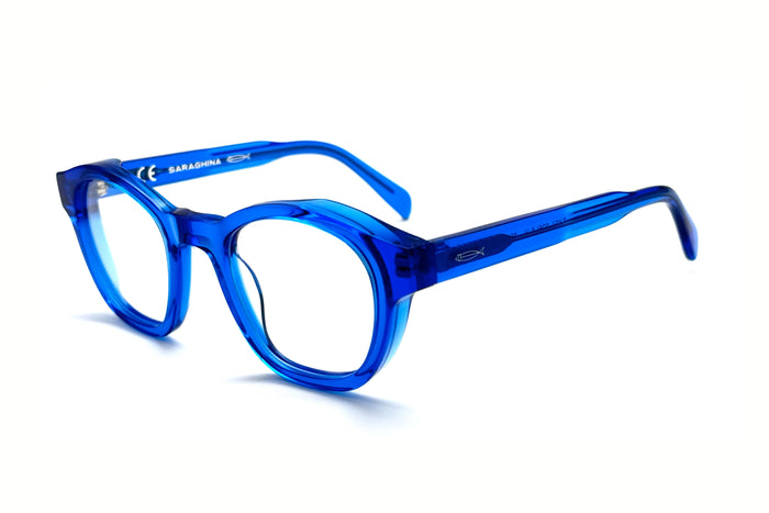 occhiali da vista saraghina modello axel in acetato con frame blu e lenti lente grigia